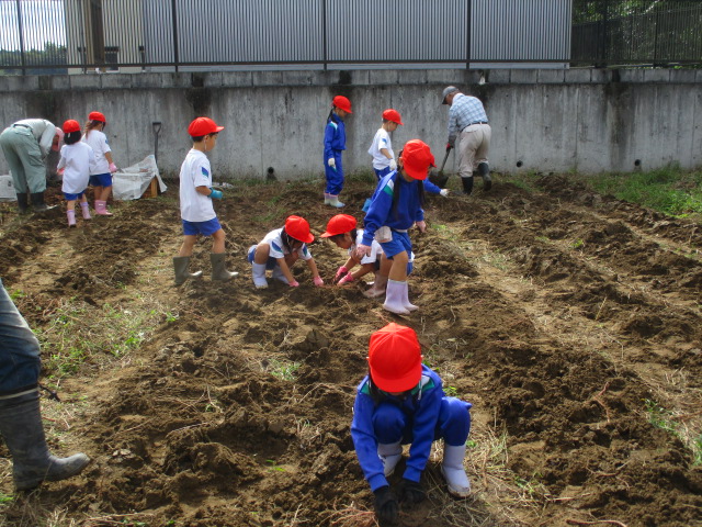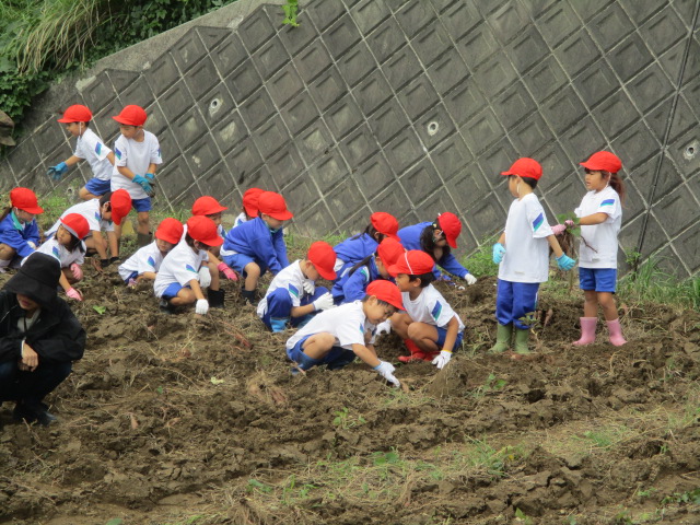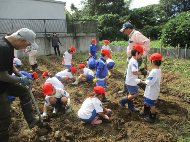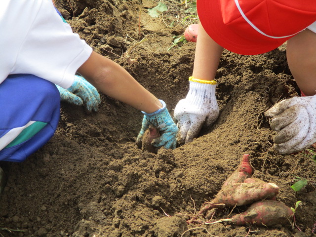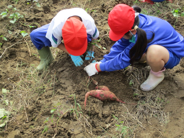 5月に植えたさつまいもの苗が大きく育ち、「いもほり」ができました。今年は、暑い日が多く、雨不足などもあって、小ぶりないもが多かったようですが、子どもたちは広い畑を端から順番に掘っていき、楽しい「いもほり」体験になりました。これまで、水やりや草取りなどのお世話をしていただいたり、いもほり前に掘りやすいように準備をしていただいたりと、鶴友会のみなさんには本当にお世話になりました。ありがとうございました。