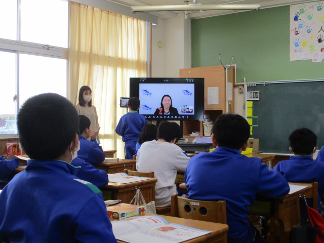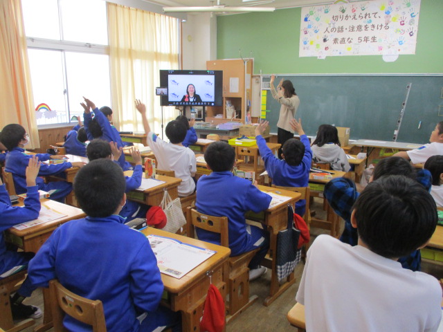 5年生が味の素の出前授業で、「だし」について学びました。神奈川県にある会社の担当の方と教室とを、リモートでつないで教えていただきました。