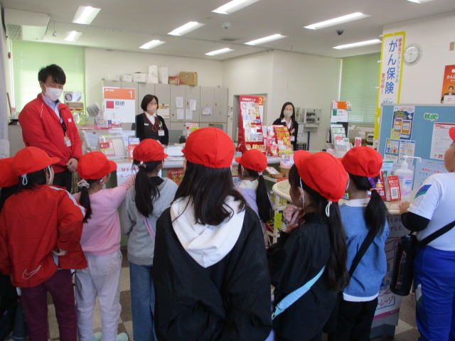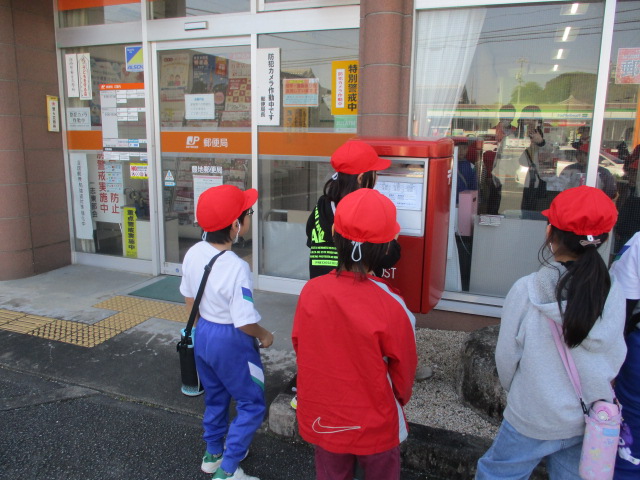 初めに、豊地郵便局で自分で書いた「はがきを出す」体験をしました。窓口で郵便局の人に渡したり、建物の外にあるポストへ投函したりしました。はがきが届くのを楽しみに考えて、わくわくドキドキしながら出しました。