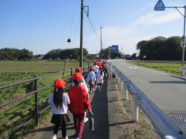 次に、交差点近くにある下之庄の「花壇」を見学しました。とてもきれいに手入れされていて、記念写真も撮りました。さらに、嬉野中学校まで行って、自分たちの行く中学校を外側から見学しました。子どもたちは、運動場の広さに驚いていました。