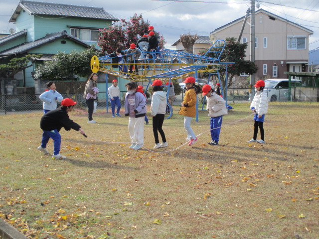 バスで島田へ行き、持ち帰り弁当を作っているお店の方のお話を聴きました。子どもたちは朝からお腹がすいてしまったようです。その後、島田の町を歩いて、防火水槽やお寺、町並みを見学しました。もう一度バスに乗り、学校でトイレ休憩をしてから一志団地の公園へ行きました。公園の遊具や長なわで楽しい時間を過ごしてから、歩いて学校まで帰ってきました。