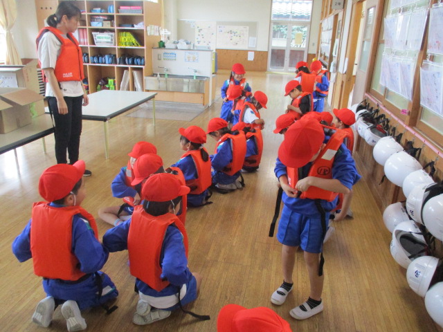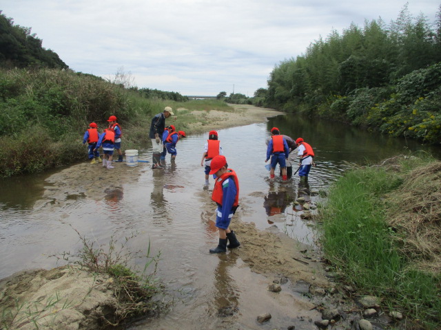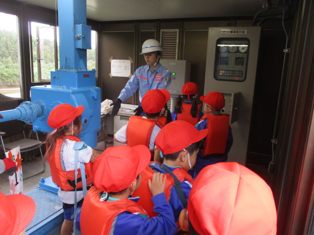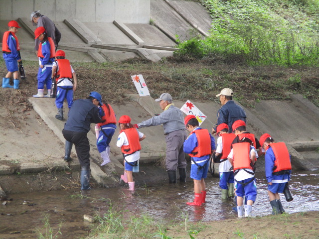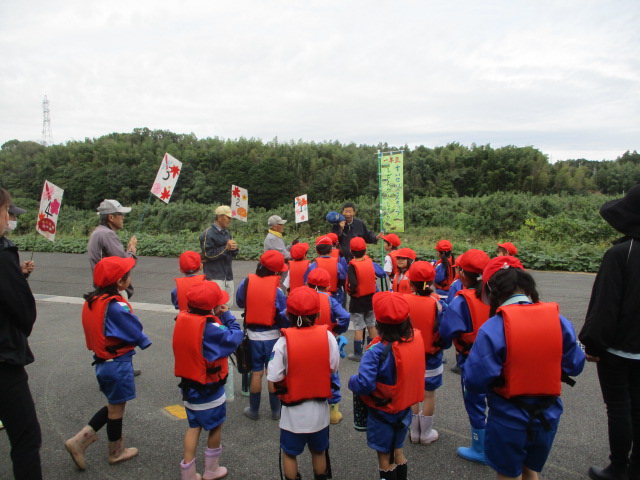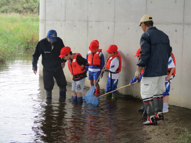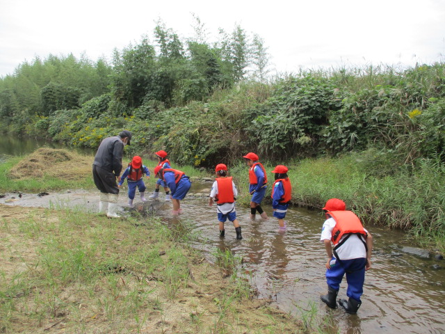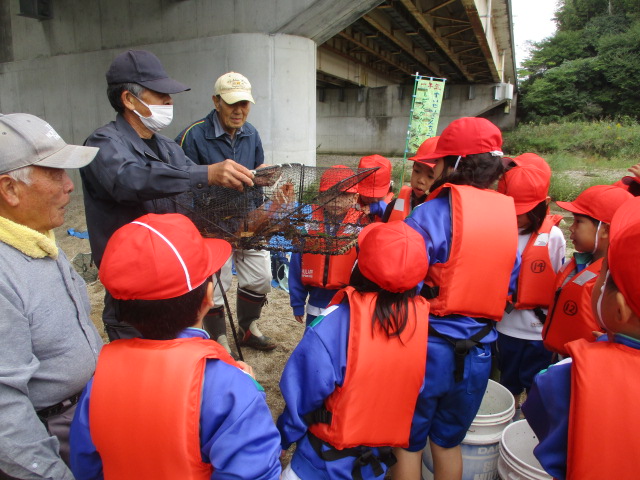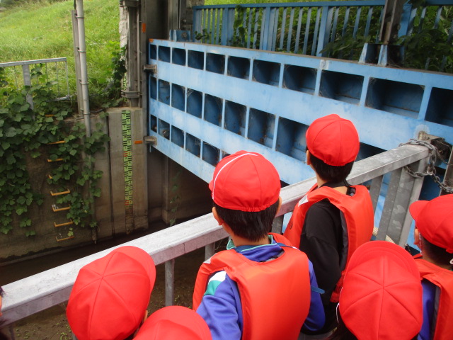 子どもたちはライフジャケットを着て、長靴をはき、教室には着替えも準備して出かけました。川へ入るため、地域の方5人に来ていただいて、川まで歩く時の案内や、川へ降りていくときの補助など、川で魚を獲る体験以外にも、いろいろな面でお世話になりました。途中、県の担当の方にも来ていただいて、水門が動く様子を見せていただいたり、小屋の中を見学させていただいたりしました。