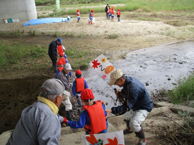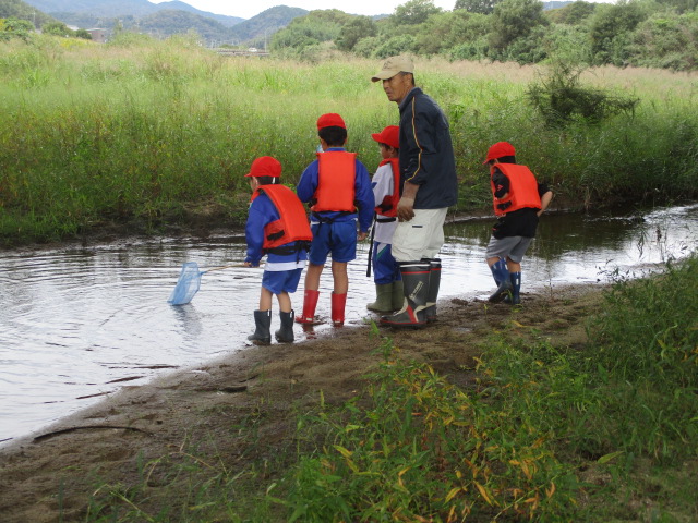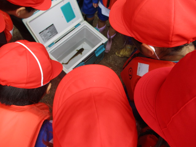 川へ到着すると、魚を探して水の中を歩いたり、タモを順番に使って小さな魚を獲ったりして、とても楽しく体験学習をすることができました。最後に、仕掛けた網に入っていたカニやナマズも見せていただくこともでき、大満足の様子でした。