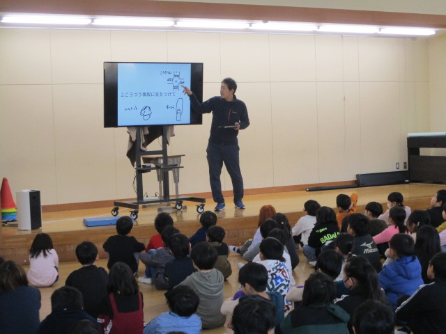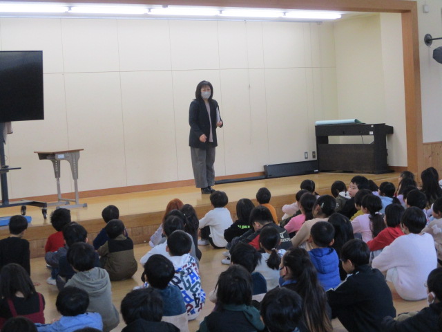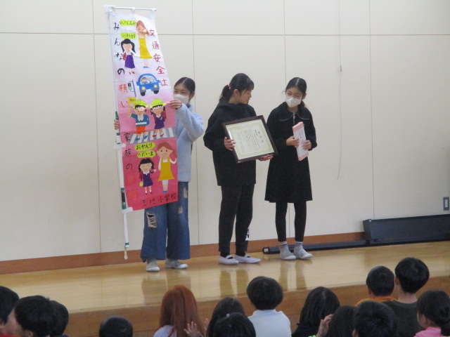 冬休み前集会では、校長先生と生活指導の先生から「規則正しい生活をしましょう」「事故や健康に気をつけて過ごしましょう」などのお話がありました。その後、表彰伝達を行いました。