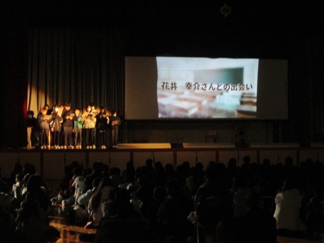 それぞれの学校で、これまでの人権学習で学んだことを、担当の2つの小学校から発表しました。中学校からは、映像やクイズ、人権劇の発表があり、それを観て「自分らしく生きること」「やさしさ」などについて、みんなが考えたり意見を発表したりしました。その場で全員が自分の考えを発表することはできなかったので、学校へ戻ってから考えを整理したり、話し合ったりしました。