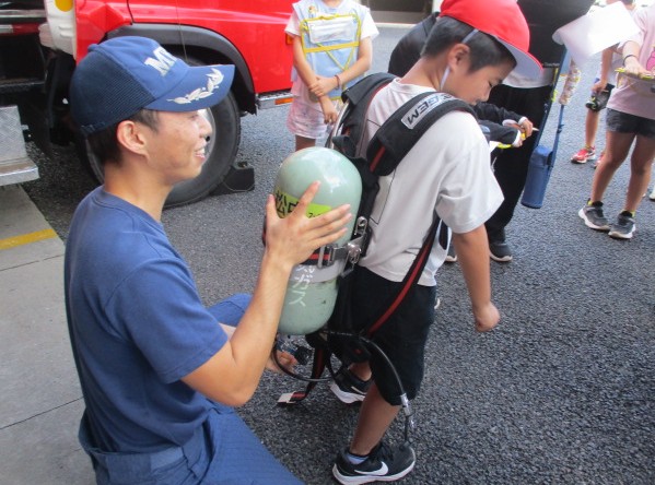 消防署では、はしご車・タンク車・ポンプ車などの消防車や救急車について、直接見ながら説明していただいたり、車の中に入って見学させていただいたり、備え付けの道具類について説明していただいたりしました。ボンベやホースなどを持たせてもらえる場面もあり、消防士さんの仕事のたいへんさを実感したようです。消防士さんへの質問もいろいろさせていただき、しっかり話を聴くことができました。