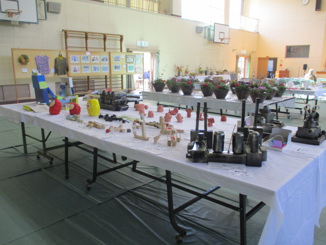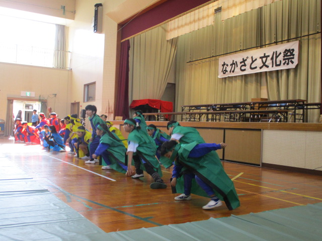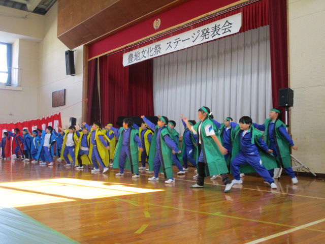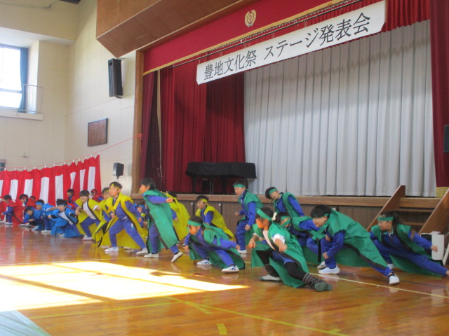 豊地文化祭には児童全員の平面作品と書写作品を、中郷文化祭には中郷地区の児童の立体作品と書写作品を展示発表しました。また、当日参加できた3・4年生が、運動会で踊った「豊地ソーラン」を、どちらのステージでも力いっぱい元気に発表しました。