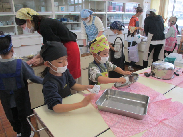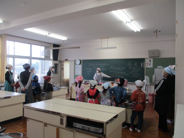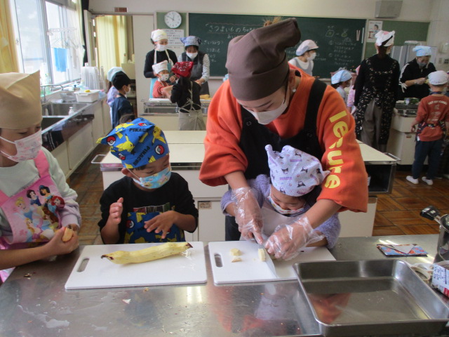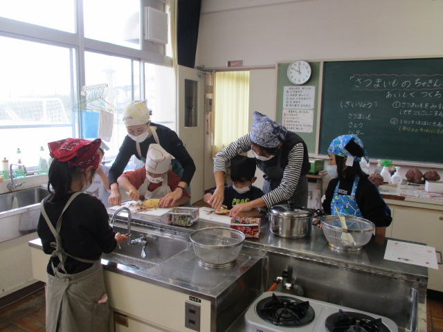 今週は、1・3・4年生で授業を行いました。3年生は「食べ物の3つのはたらき」について考え、給食が栄養バランスを考えて作られていることもわかりました。4年生は「給食に使われている松阪の食材」について学びました。中には、松阪の食材だと知らないものもあり、改めて、給食のありがたさを感じた子もいました。1年生は「さつまいもの茶巾しぼり」を作りました。調理室での実習になるため、保護者の皆様にも呼びかけて学習ボランティアとして協力していただき、大人がしっかり見守る中で実習することができました。