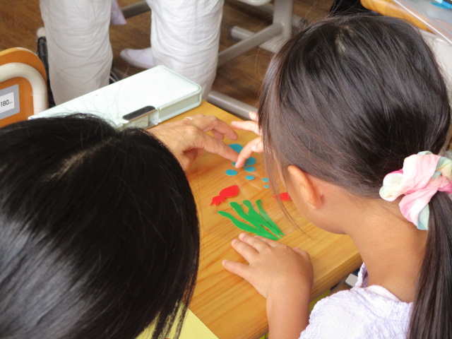 透明なアクリル板に、シール状のセロハンを好きな形に切りぬいて貼って模様や絵を作り、一人ひとり個性豊かな「うちわ」ができていました。細かい作業もありましたが、お家の人に来てもらって一緒に過ごせることをとても楽しみにしていて、嬉しそうな笑顔がいっぱいでした。できあがった「うちわ」を持って、お家の人と一緒に記念撮影もしました。