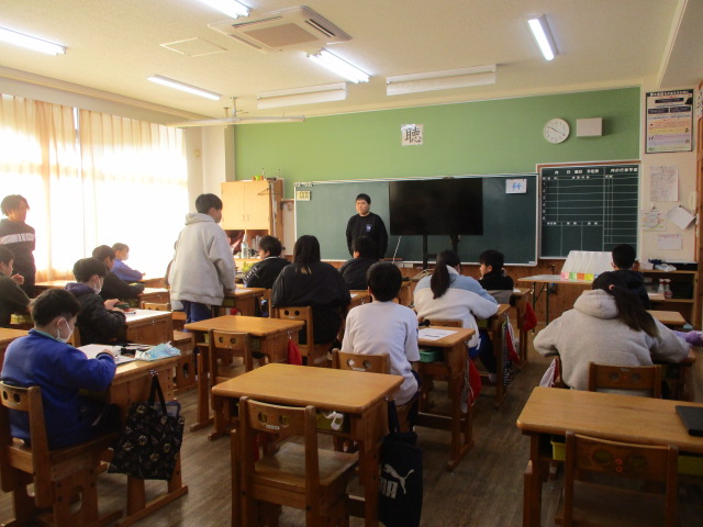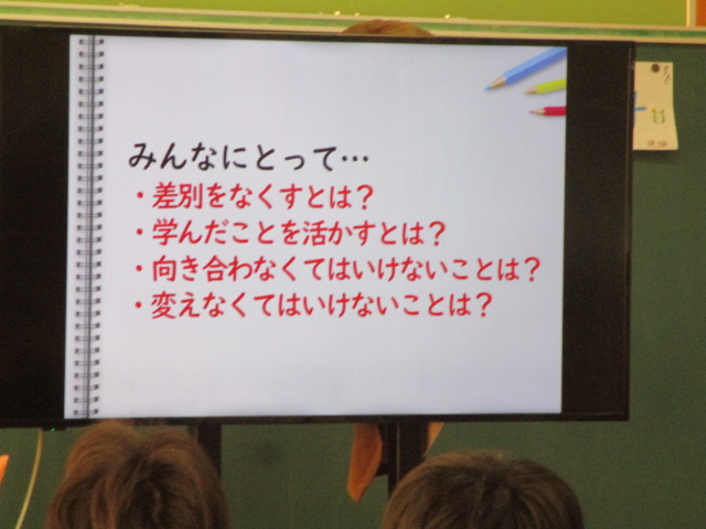 原田さんには、ご自身がこれまで考えたり経験したりしたことを中心に話をしていただきました。部落問題だけでなくいじめなどの人権問題はする側に責任があることを教えていただいたり、もしも困っている人がいた場合、自分はどの立場に立つのかなどについて考える機会を与えていただいたりしました。子どもたちにとっての教室を自分たちの社会と考え、それをつくっている1人として、自分は何ができるのか、何をするべきなのかなど、具体的に身近なこととして考えることができました。