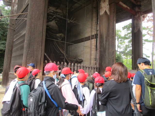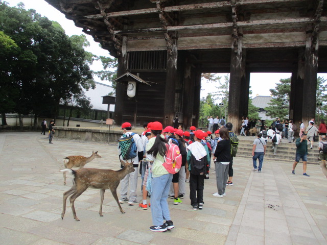 法隆寺では、七不思議の内の3つを探すことに挑戦したり、歴史ある建物や宝物をじっくり見学したりできました。東大寺では、奈良公園の鹿や鹿のフンをよけて歩くことに苦労したり、大仏の大きさや観光客の多さに驚いたりしました。鹿せんべいをあげることや鹿に近づくことは、マダニ対策として行いませんでしたが、買い物を楽しむことができました。帰路につくと、もっとこの社会見学が続けばいいのに・・・と思いながらバスに乗っている子がたくさんいました。